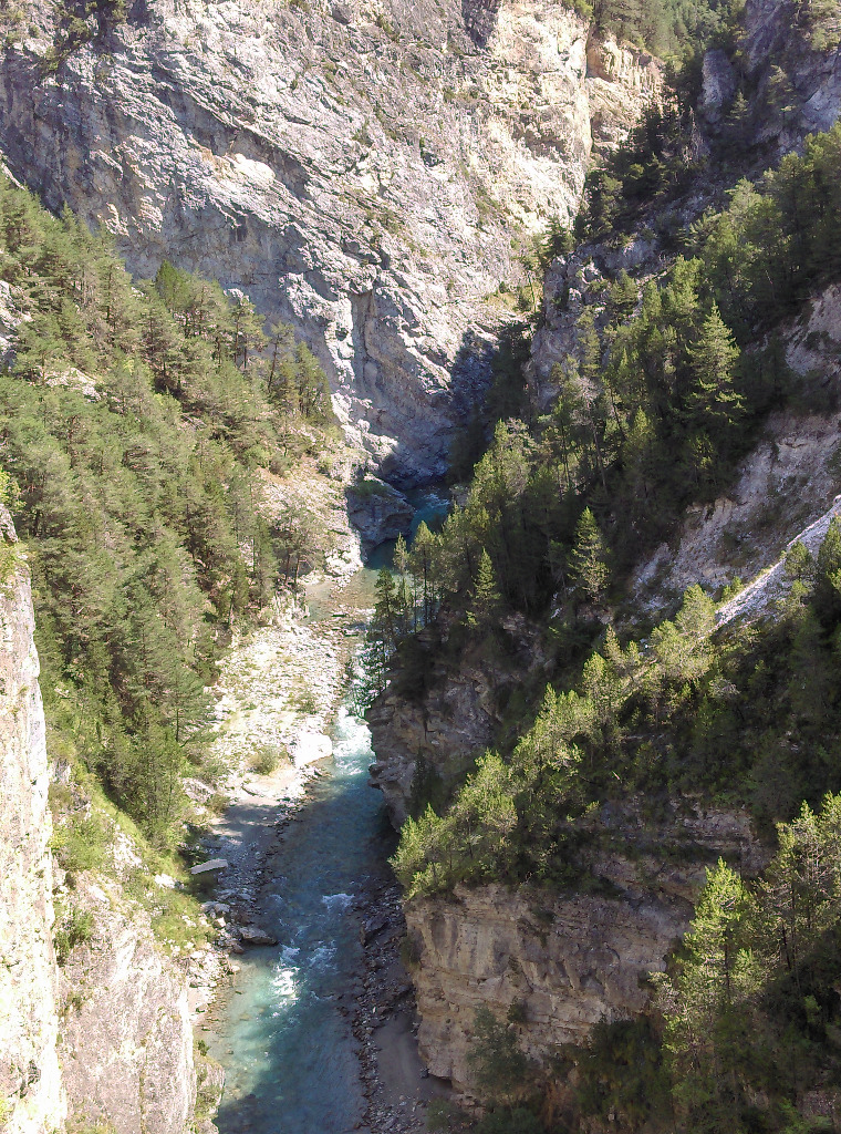 Vu d'une tyrolienne au dessus d'un canyon.